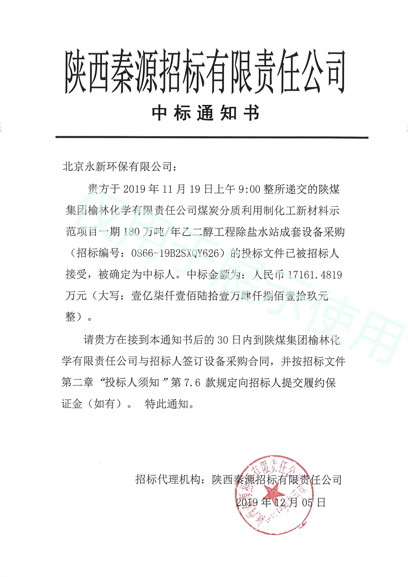 河北省廊坊市廊坊經(jīng)濟技術(shù)開發(fā)區(qū)12月5日,從陜西秦源招標(biāo)有限責(zé)任公司獲悉,北京永新環(huán)保有限公司經(jīng)過激烈的公開競標(biāo),成功中標(biāo)陜西榆林化學(xué)有限責(zé)任公司煤炭分質(zhì)利用制化工新材料示范項目一期180萬噸/年乙二醇項目除鹽水站成套設(shè)備設(shè)計采購工程,中標(biāo)合同金額1.71億元。