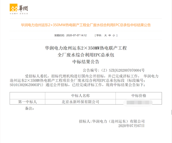 河北省廊坊市廊坊經(jīng)濟(jì)技術(shù)開發(fā)區(qū)2020年6月,北京永新環(huán)保有限公司經(jīng)過9家角逐,成功中標(biāo)華潤電力滄州運(yùn)東2×350MW熱電聯(lián)產(chǎn)工程全廠廢水綜合利用EPC總承包項(xiàng)目.
